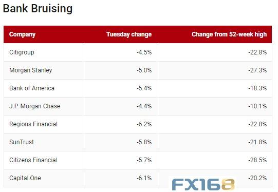 收益率曲線趨平導(dǎo)致投資者對(duì)銀行股進(jìn)行了拋售,因?yàn)樗麄儞?dān)心這種現(xiàn)象可能會(huì)損害銀行的貸款利潤(rùn)率。SPDR區(qū)域銀行ETF下跌5.5%,收低20%至52周高位。這也是自2016年6月以來(lái)最糟糕的一天。潛水泵