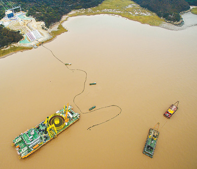 12月19日,連續(xù)經(jīng)過5個(gè)多小時(shí)的登陸施工后,在跨越17公里的海域后,世界第一個(gè)500千伏交聯(lián)聚乙烯海纜鋪設(shè)工程的最后一條輸電海纜(共3條),連接上位于浙江省舟山市金塘大鵬島的終端站,