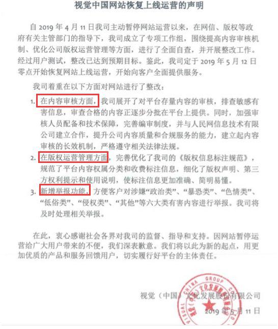 視覺中國公告稱,公司于 2019 年 5 月 12 日零點開始恢復網(wǎng)站上線運營,開始向客戶全面提供服務。